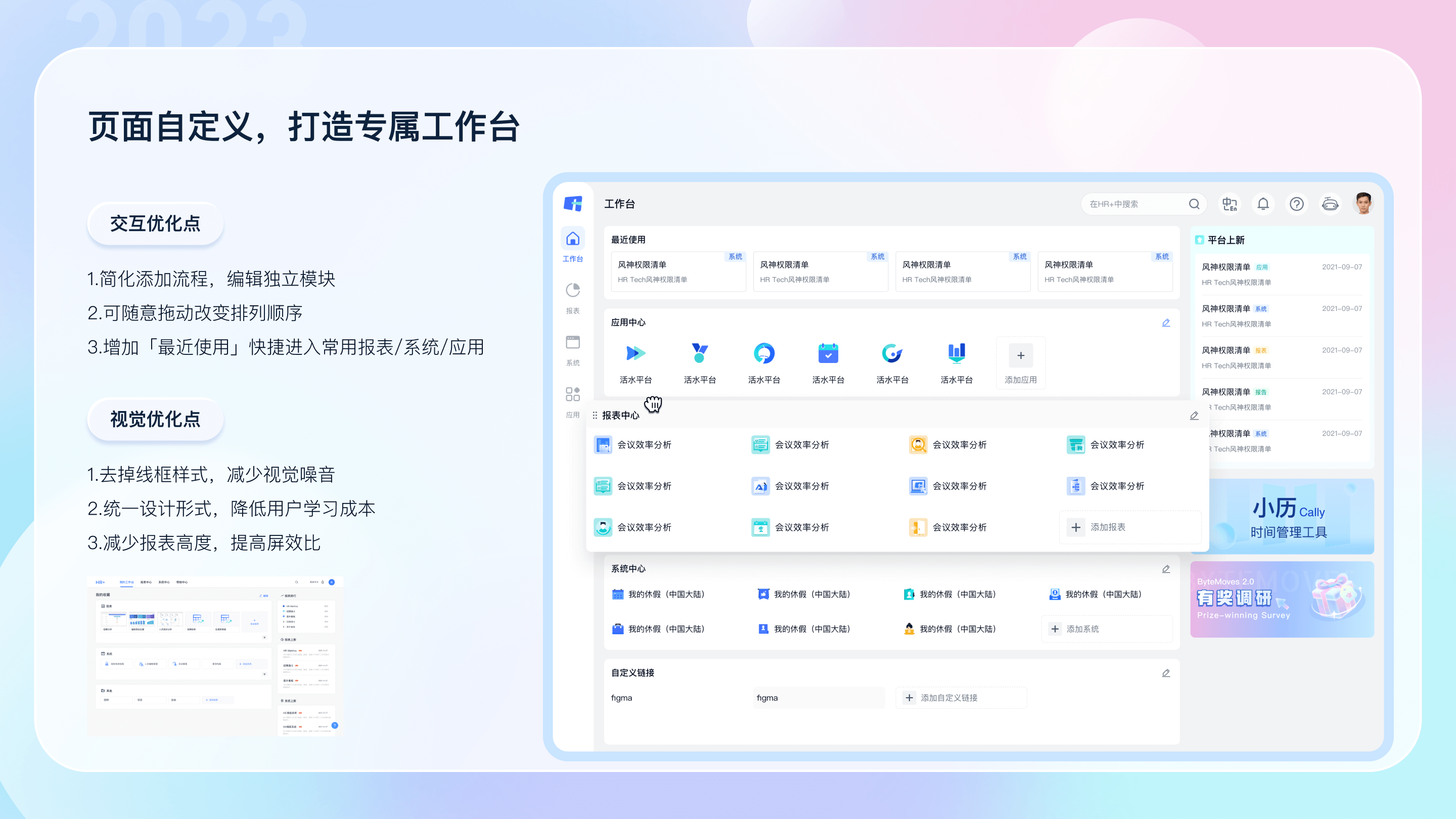 作为HR+项目的设计接口人,PM、IS深度共创,拆解业务目标,分别总结各模块存在问题,提出设计方案。
